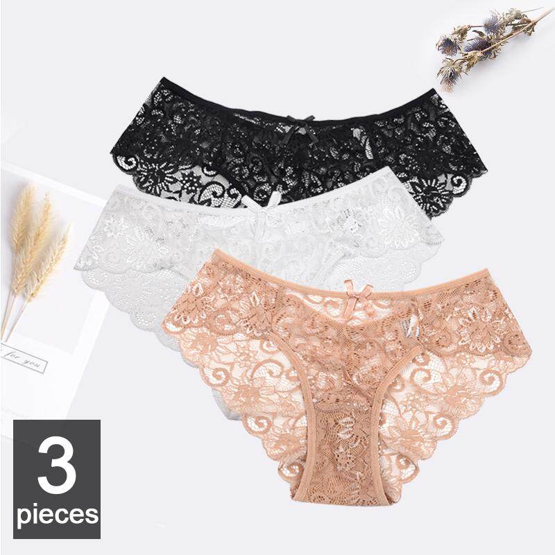 มองหา 3pcsPack Sexy Underwear Women Lace Panties Transparent Bow Women Briefs Mid Waist S to XL ราคา 146 บาท ส่งฟรี!!!